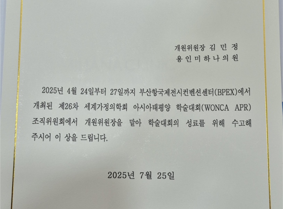 김민정 대표원장님 WONCA APR 조직위원회 개원위원장 특별공로상 수상